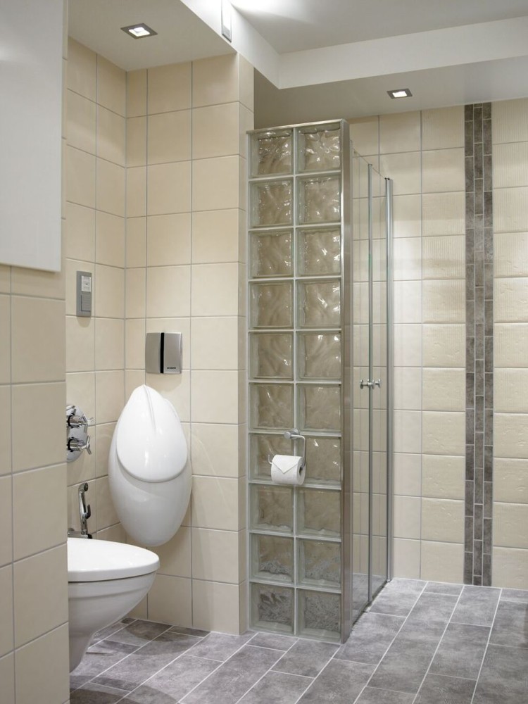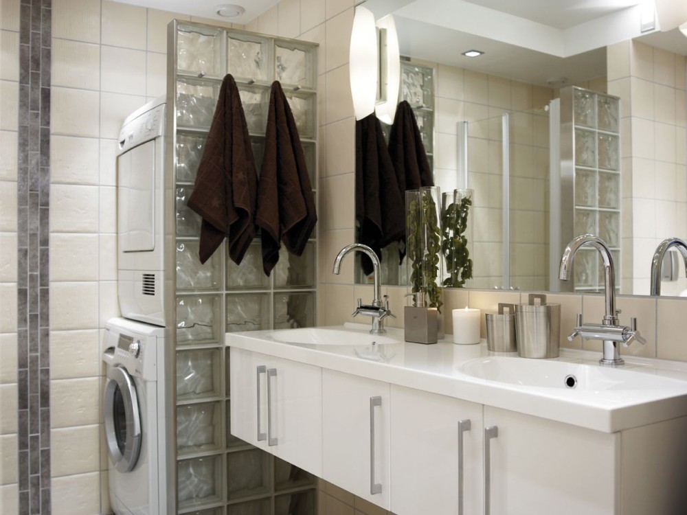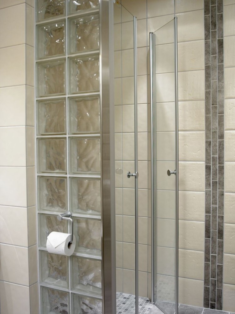 Dette badet er på litt over 6m2. Siden dette er et kombinert familiebad og vaskerom, valgte man å dele av rommet med en vegg av glassbyggerstein.